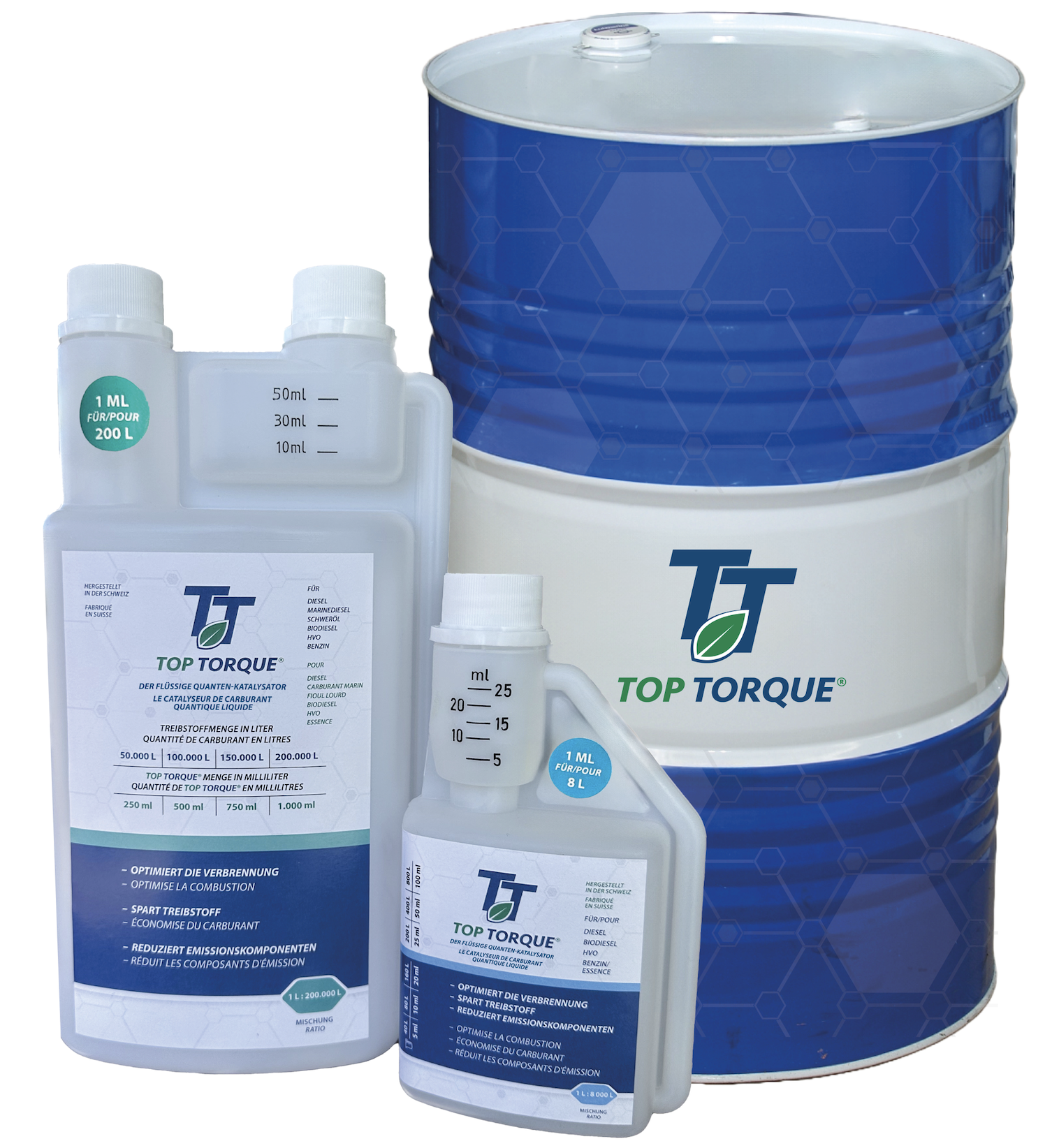 TOP TORQUE®, der seit 2024 zertifizierte flüssige Quanten-Katalysator zur Einsparung von Treib- und Brennstoffen, CO und Senkung von Luftschadstoffen. Ein revolutionäres Produkt, das in langjähriger Forschungsarbeit entwickelt wurde.