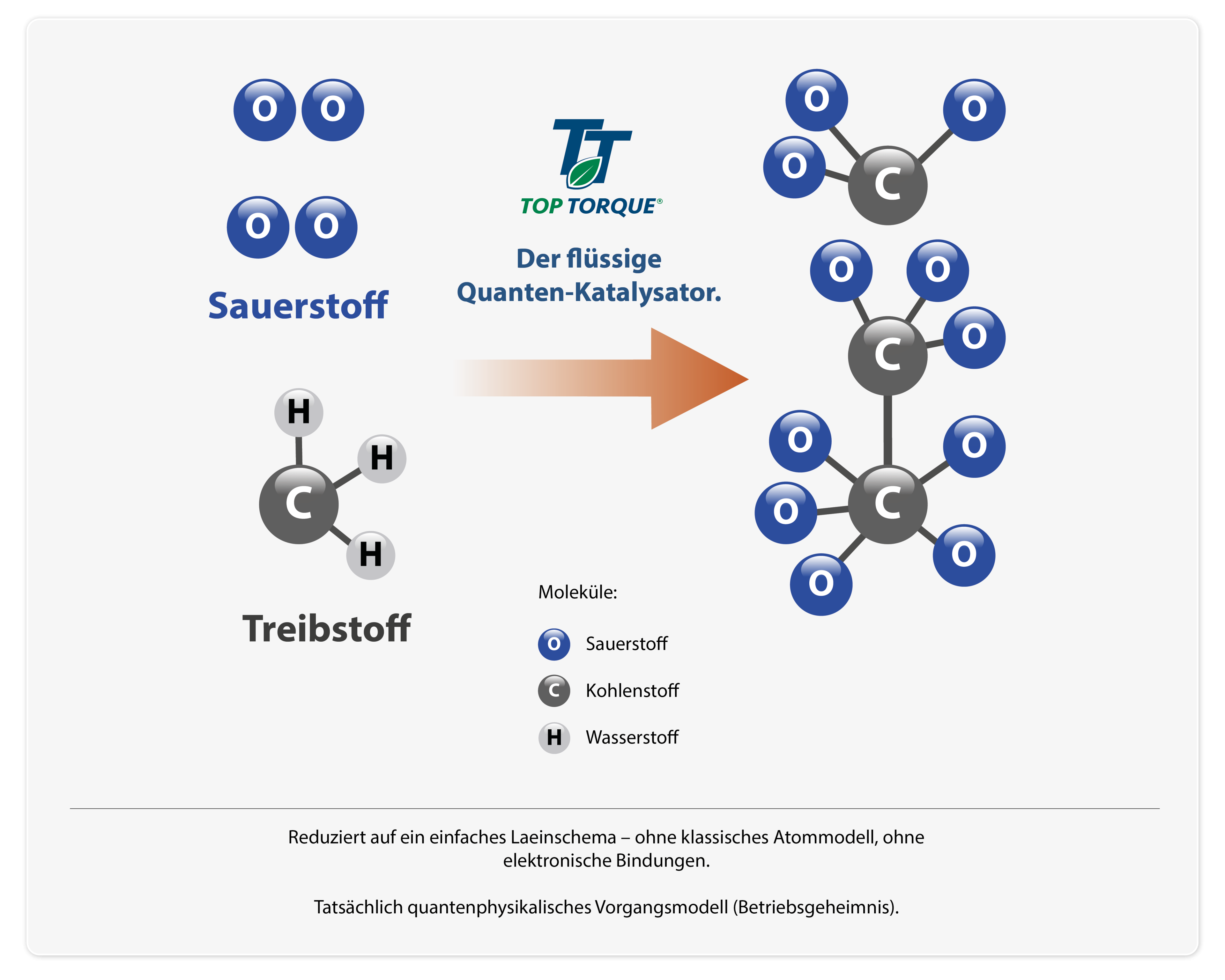 Kohlenstoff verbindet sich mit Sauerstoff. Das Fehlen von Wasserstoff vereinfacht die Grafik, um die zentrale katalytische Wirkung hervorzuheben – nämlich die verstärkte Sauerstoffbindung an Kohlenstoff, die durch TOP TORQUE® ermöglicht wird.